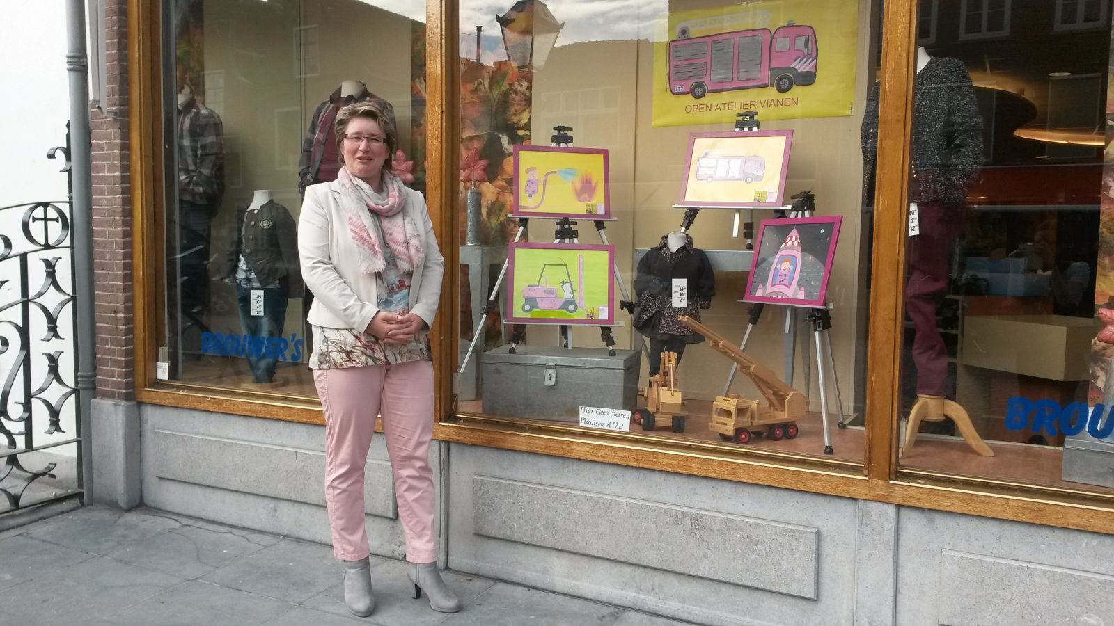 We hebben samen in overleg de etalage her-ingericht. Brouwers heeft een flinke voorkant in een historisch pand. Deze was al in mooie herfsttinten ingericht en ik mocht zowaar een heel raam met haar invullen. Ik ben heel dankbaar dat ik zelfs vier illustraties op meegenomen ezeltjes mocht zetten. Dat is toch wel heel bijzonder vriendelijk! En als klap op de vuurpijl mocht het kleine spandoek met de Roze Brandweerwagen ook nog opgehangen worden! Wat een droom-ontvangst! Afgesproken is dat ik nu nog een wat groter kaartje maak dan de visitekaartjes met daarop mijn naam en adres zodat het voor iedereen duidelijk is wie daar exposeert. Ik ben erg benieuwd of dit meer bezoekers zal genereren tijdens Open Atelier Vianen.